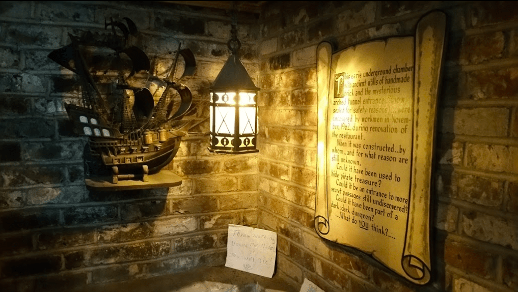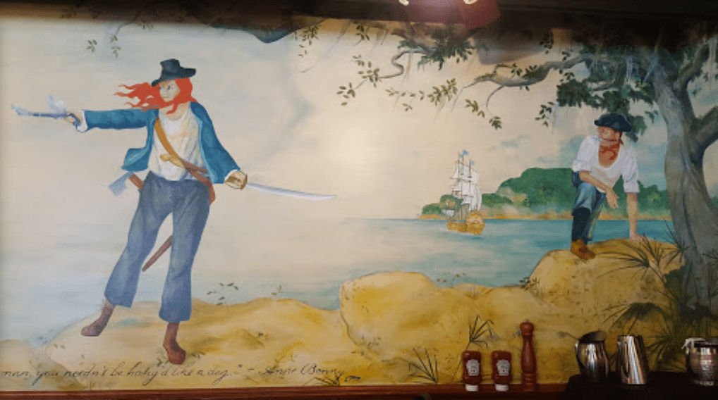 In the Captain’s Room and The Treasure Room, framed pages from a rare early edition of Treasure Island hang on the walls. The tavern gained fame through Robert Louis Stevenson’s classic novel, where Captain Flint is said to have died in an upstairs room, shouting his final words, “Darby, bring aft the rum.” The story’s infamous Long John Silver claims, “I was with Flint when he died at Savannah.”