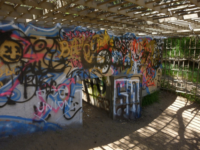 As I followed the Old Zoo Trail winding higher up the canyon slope, I came across ominous squat cages and the weathered—and sometimes creatively vandalized—backsides of the grottos, where holes had been cut in the protective fences, allowing curious explorers to slip through.